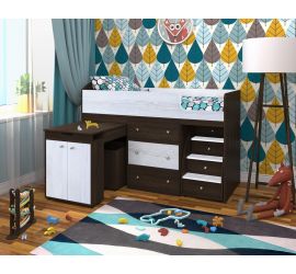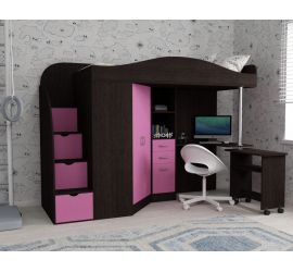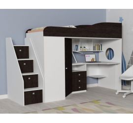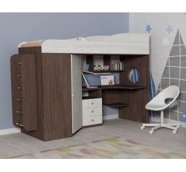 Второй вид кроватей-чердаков рассчитан на возраст детей от пяти лет. Спальное место в таком случае располагается на высоте 1,3-1,6 метра. На первом ярусе чаще всего есть шкаф и рабочая зона в формате письменного стола и книжных полок.
